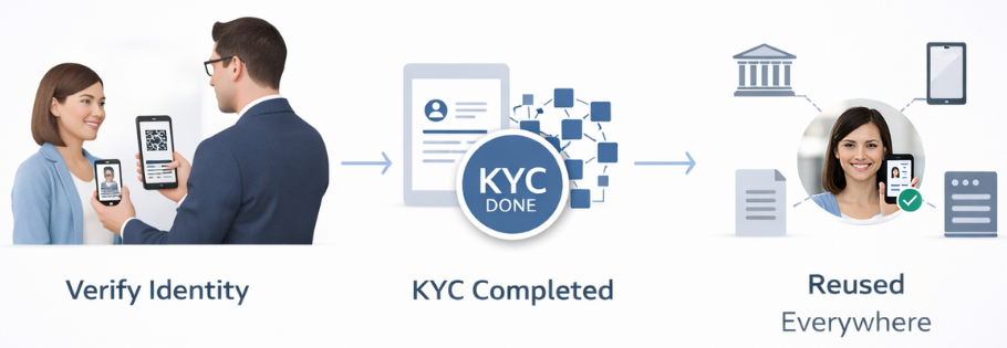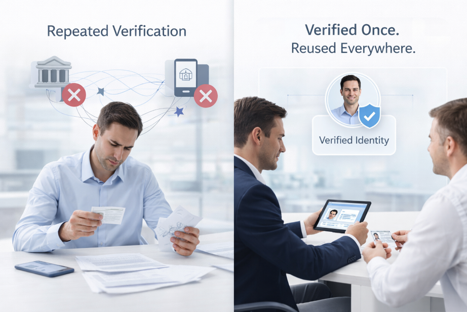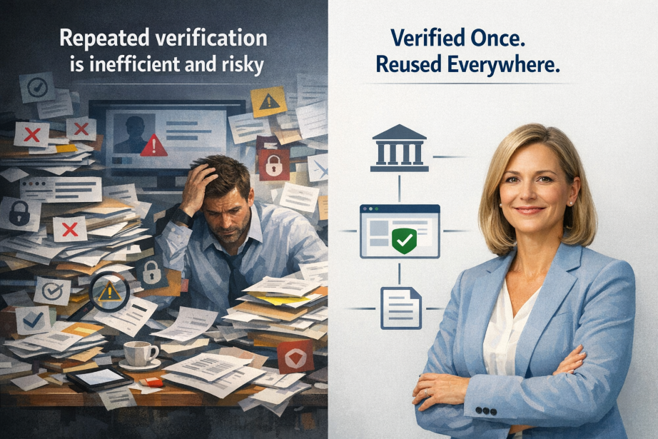 Every new service requires users to resubmit documents while institutions independently verify, store (or outsource) data, and pay for the process repeatedly.