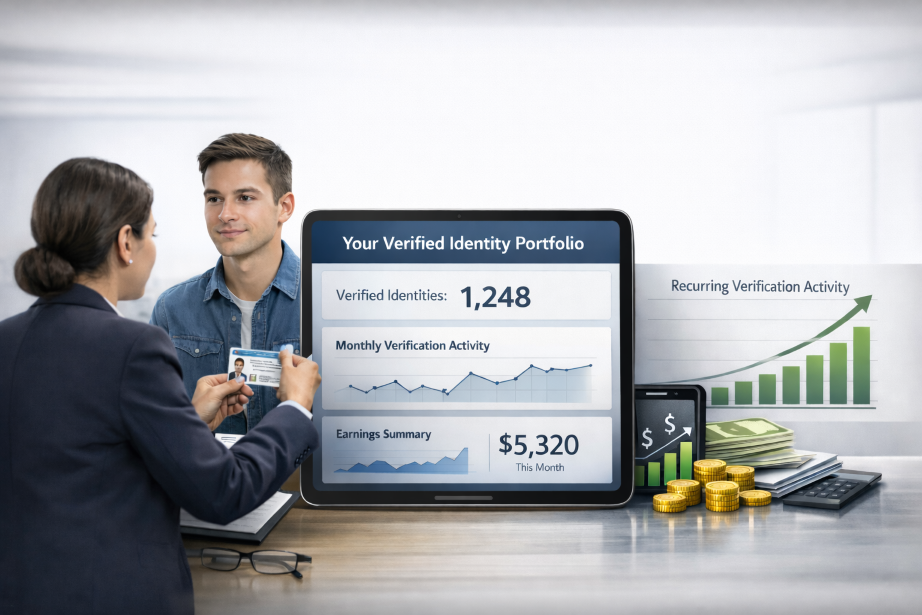 When that person later needs to re-verify their identity for a bank, marketplace, mortgage, or other participating platform - and they authorize the reuse - a verification fee is paid by the business. You, as the originating Agent, receive your ongoing share based on your tier.
